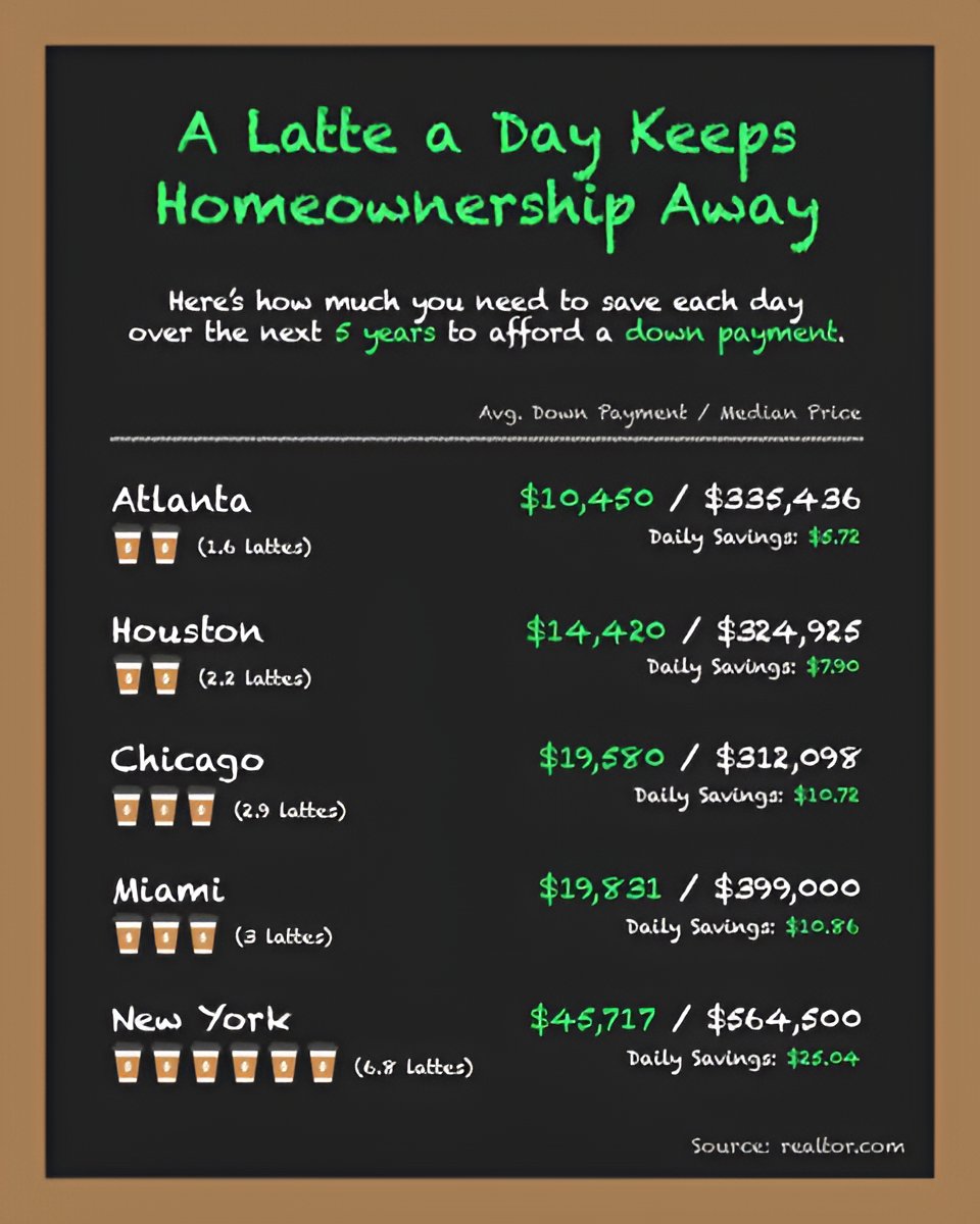 - Saving for a down payment takes a little discipline, so limiting your extra purchases (like a latte a day from your favorite coffee shop) will help you get there faster.