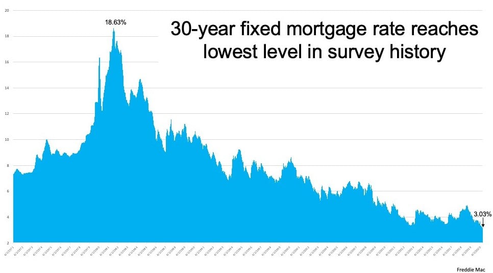 Over the past several weeks, Freddie Mac has reported the average 30-year fixed mortgage rate dropping to record lows, all the way down to 3.03%. Last week's reported rate reached the lowest point in the history of the survey, which dates back to 1971 (See graph below):