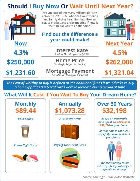 - The “cost of waiting to buy” is defined as the additional funds necessary to buy a home if prices & interest rates were to increase over a period of time.